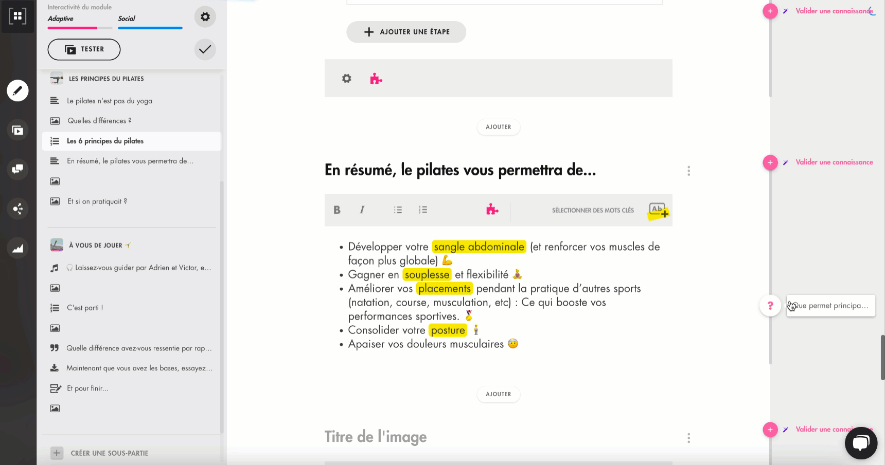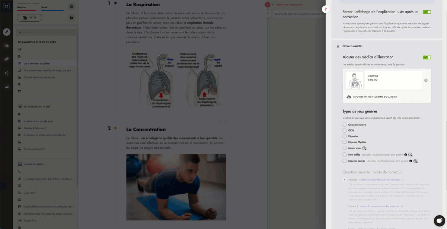 - la question de connaissance est rattachée à un contenu dans Teach Up. Pour ajouter une question, il faut au préalable ajouter un des douze contenus intégrables dans Teach Up.