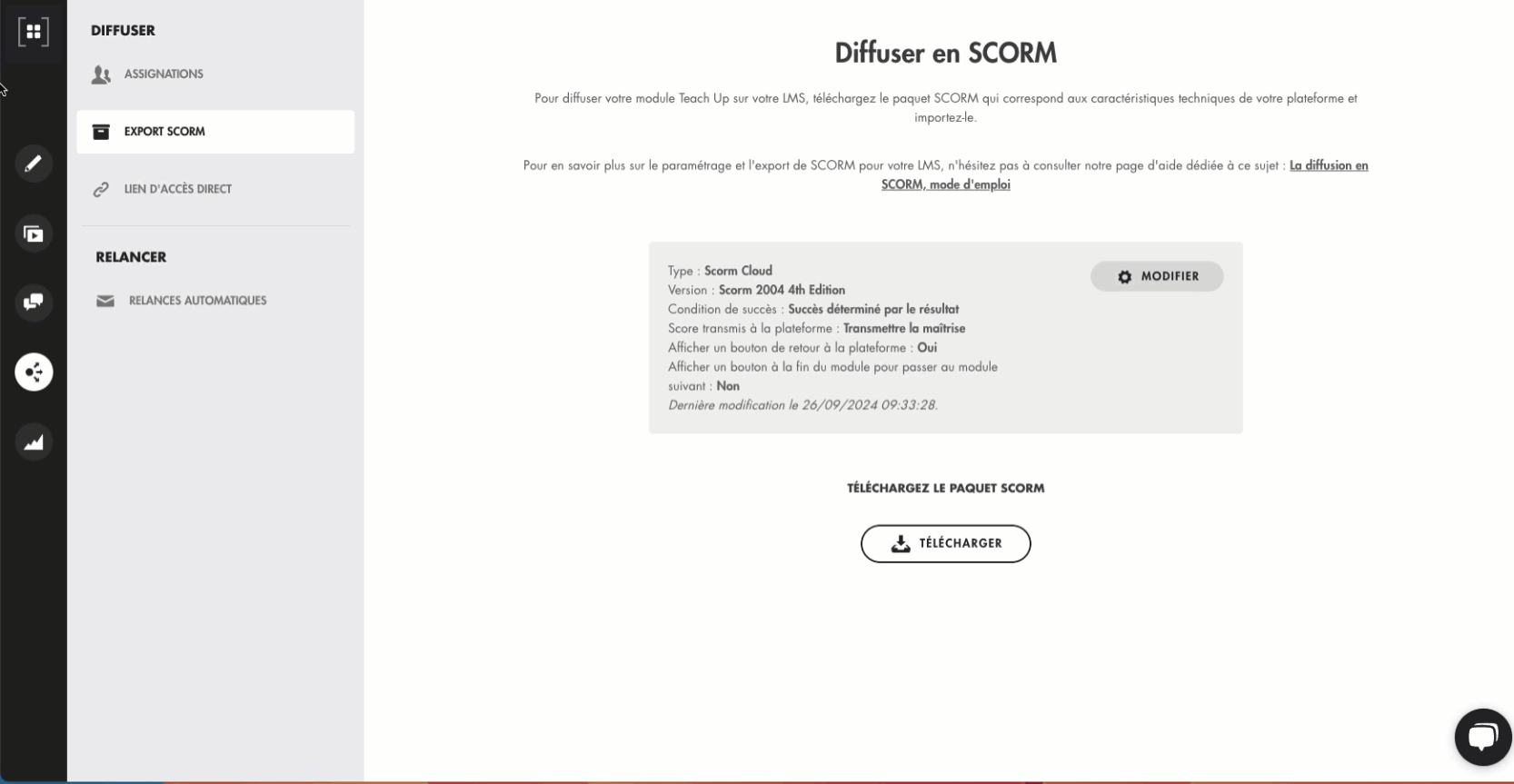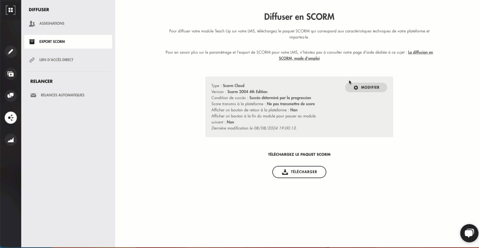 Pour paramétrer votre paquet SCORM, accédez à l’onglet « Diffuser » dans la barre latérale de navigation lorsque vous ouvrez votre module, évaluation ou parcours puis sélectionnez l'option « Export SCORM ». Cliquez ensuite sur le bouton « Modifier ».