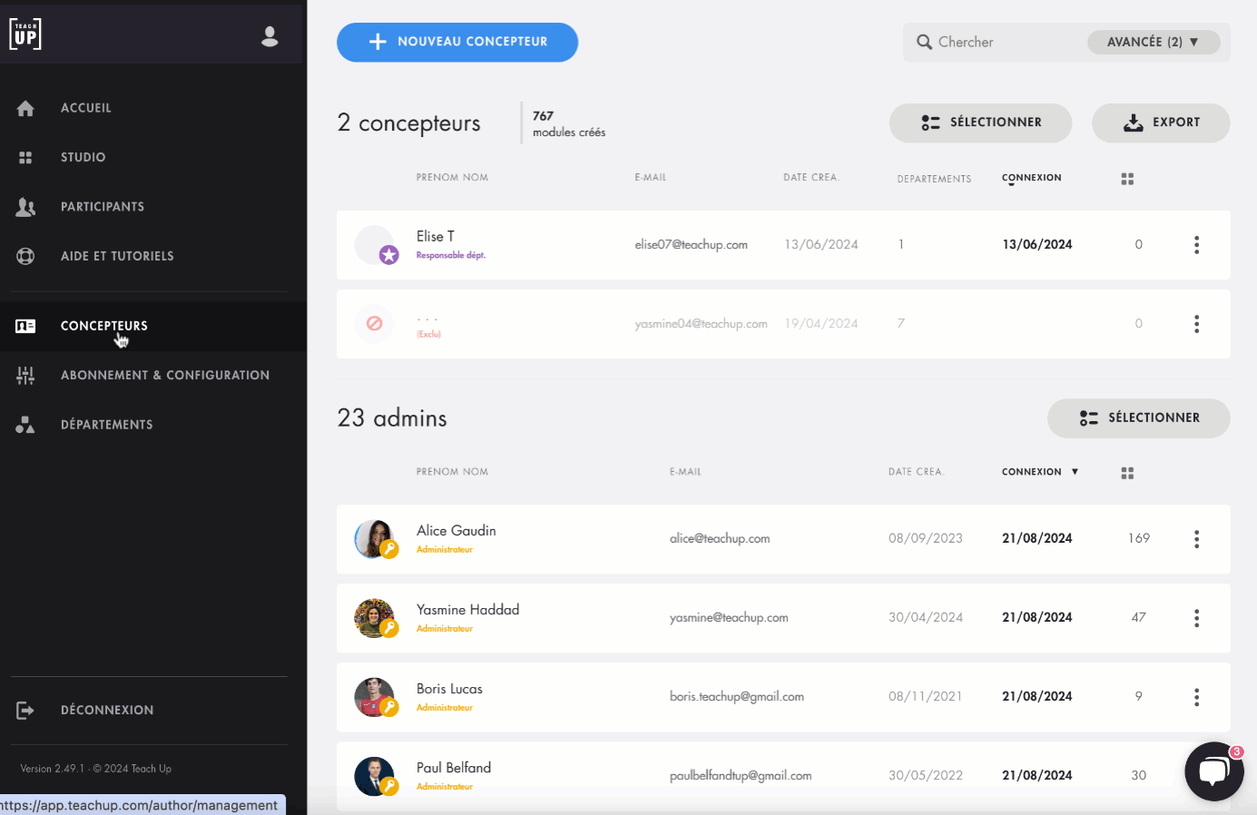 Cet article vous guide à travers les étapes d'ajout et de gestion des concepteurs dans votre interface Teach Up.