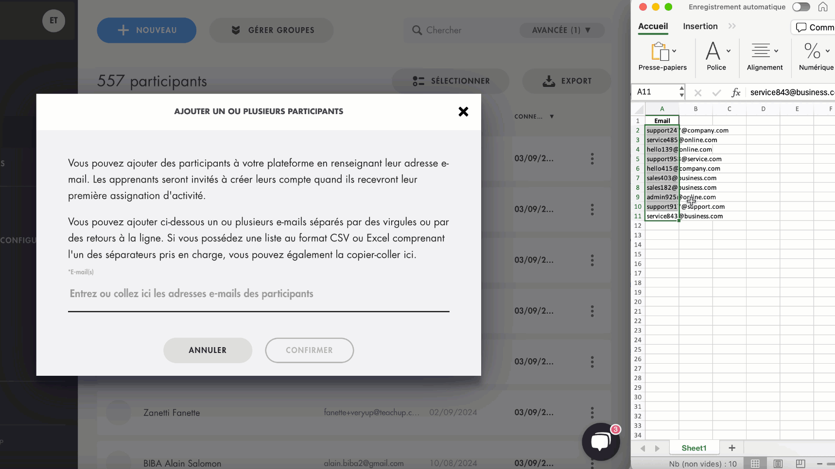 - Copiez depuis un fichier Excel ou CSV les adresses e-mail de vos participants