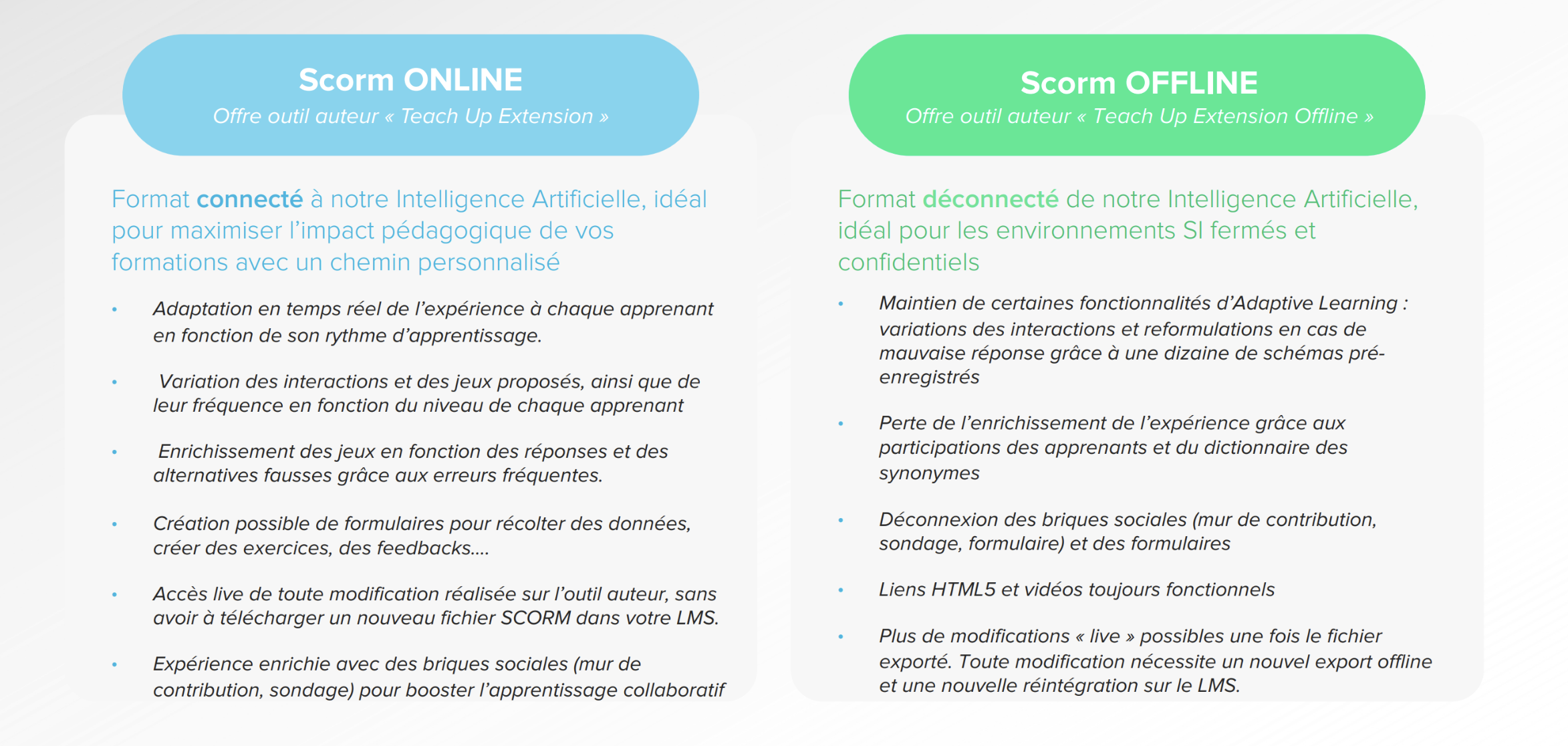 Le SCORM offline est un format d’export déconnecté de Teach Up et de son intelligence artificielle. Contrairement au SCORM online (ou SCORM Cloud), qui permet aux participants de bénéficier d’une expérience en temps réel adaptée et sociale, le SCORM offline peut être activé dans des cas particuliers pour répondre à des besoins spécifiques de certains abonnements.