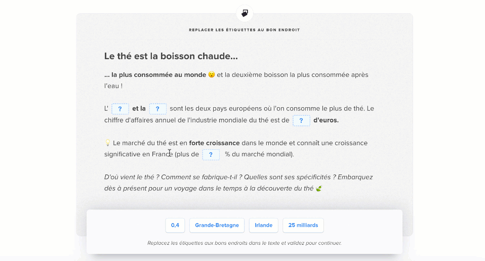 Le participant glisse et dépose dans le texte les mots aux bons endroits.