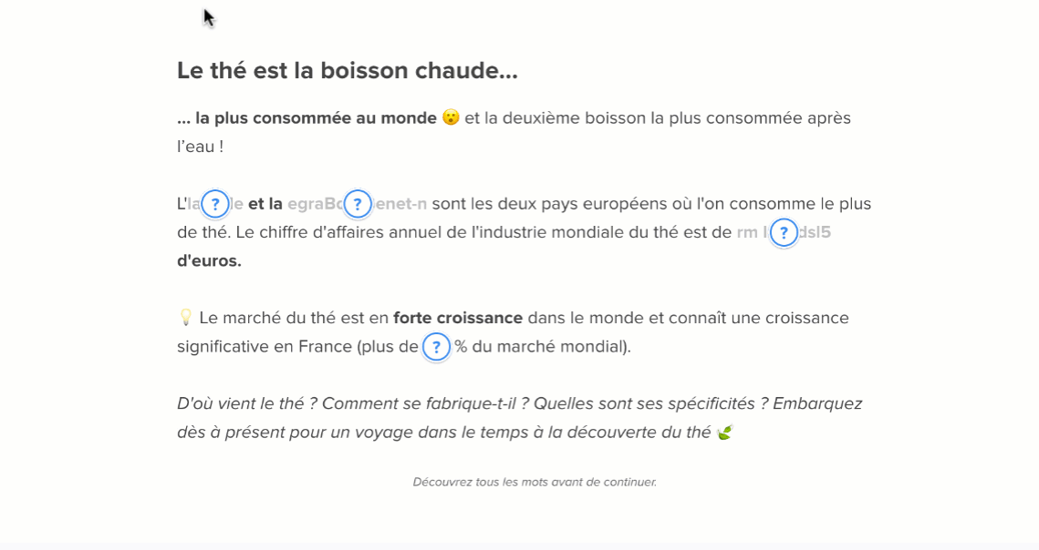 Le participant complète le mot manquant dans la phrase. Cette activité pédagogique est recommandée pour des notions déjà connues des participants.