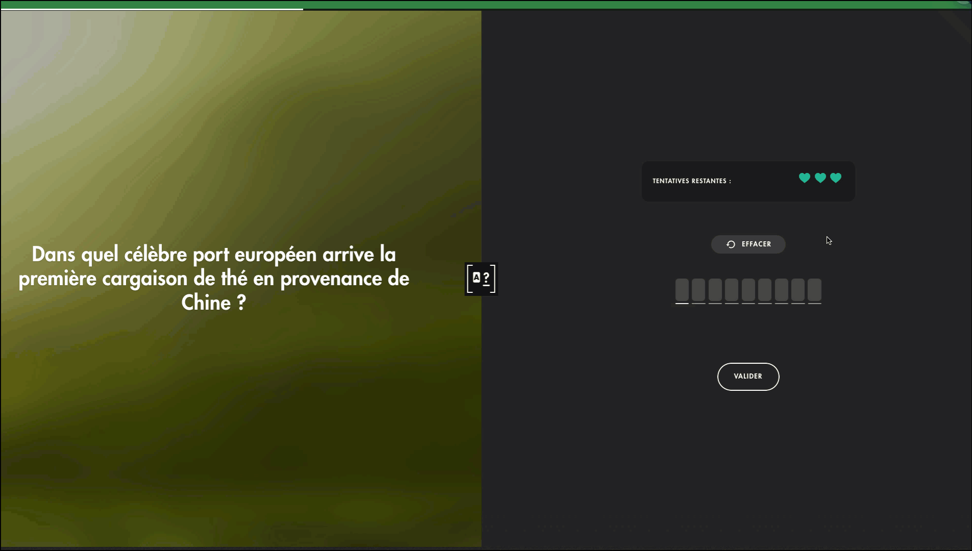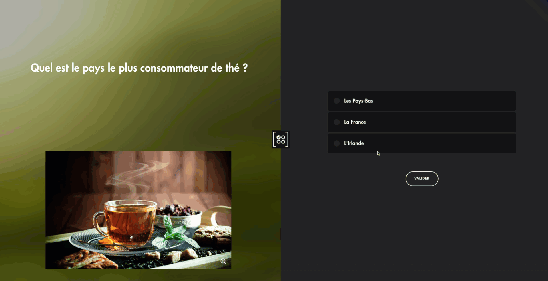 Le participant choisit parmi trois cartes, dont une masquée. Si aucune des propositions affichées ne semble juste, il peut choisir de retourner la carte masquée. Ce format permet de challenger les participants en ajoutant une part de hasard.