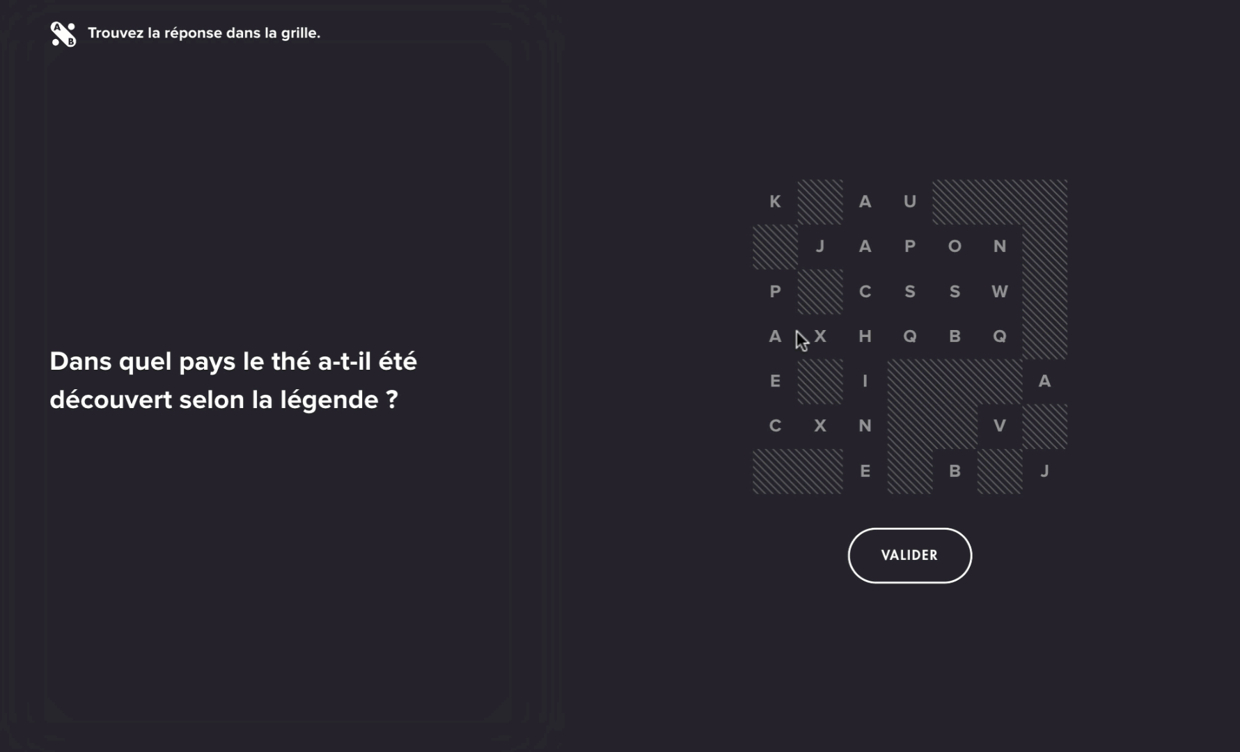 Le participant doit trouver dans une grille, le mot à trouver. Il sélectionne la première lettre puis la dernière pour sélectionner le mot en entier. Plusieurs réponses sont disponibles dans la grille.