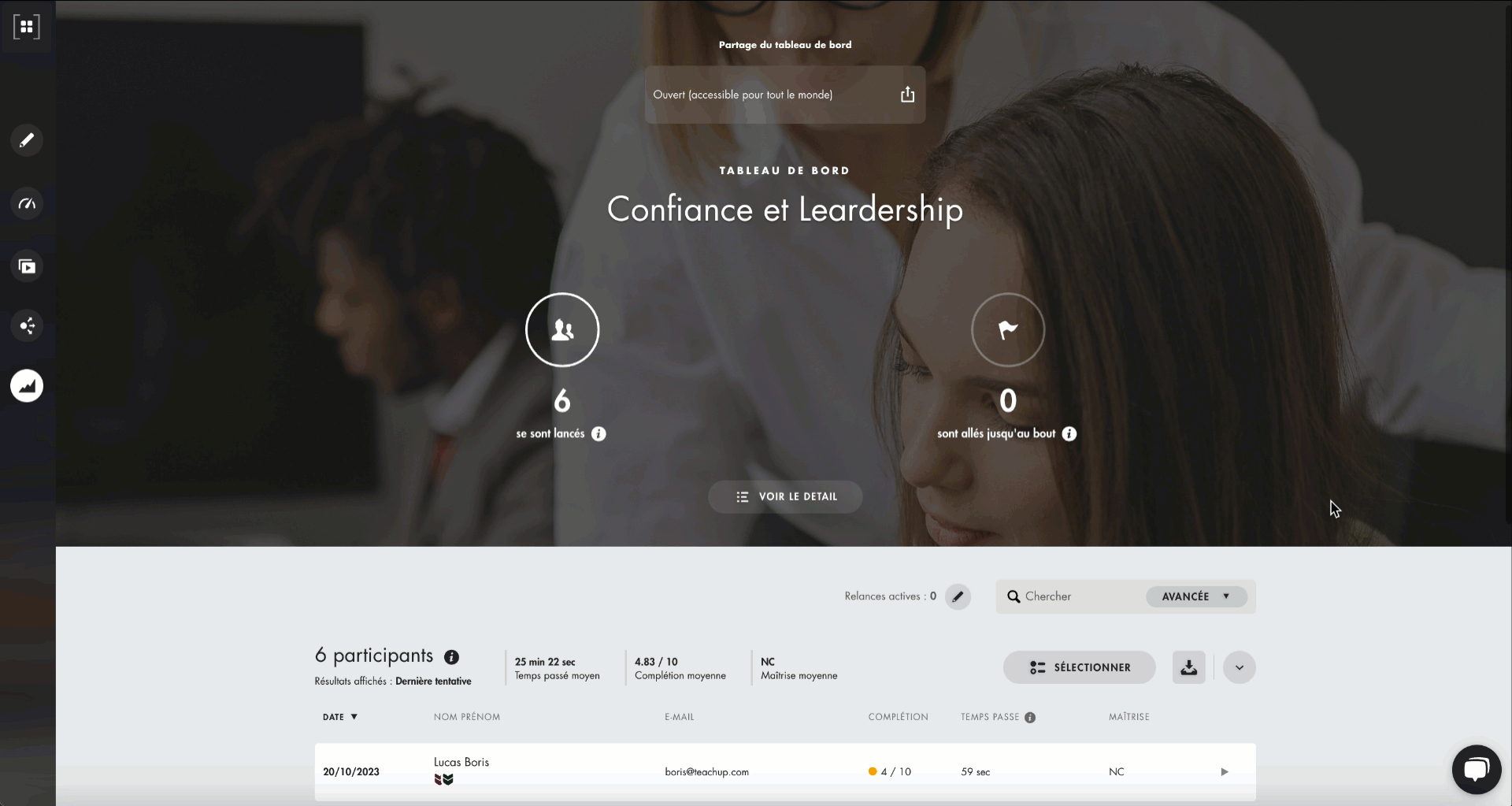 💡 Cet export permet de suivre en profondeur les activités individuelles d’un participant. Il offre une vue complète sur la progression et la maîtrise des activités assignées, ainsi que sur le temps passé. C’est un outil clé pour un suivi personnalisé, afin d’accompagner au mieux le participant dans son parcours de formation.